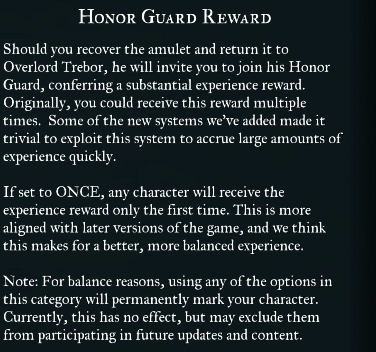 cheat countermeasures Sets whether or not the clear reward can be obtained multiple times. The clear reward is 250,000 XP, but this setting prevents it from being performed multiple times. “ONCE” Disabled Reward is only given once. “REPEATABLE” Enabled Allows it to be obtained multiple times. *Due to the following description, ” ONCE ” (disabled, only once) is recommended. It is described that there will be no change if you obtain it more than twice, but the character status screen will display “Cheat Used” in red.