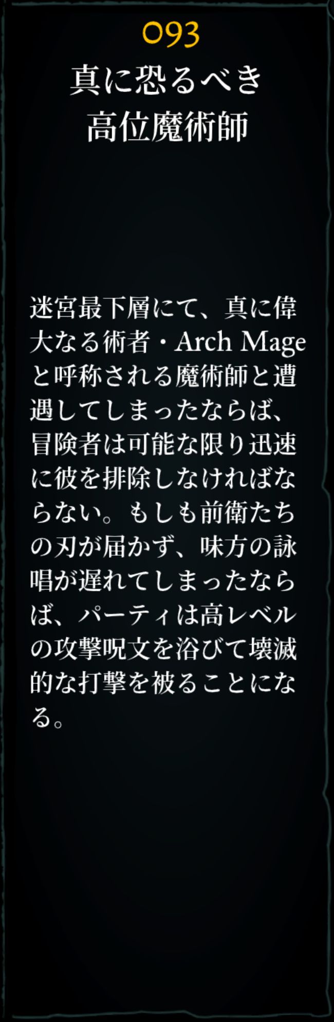 名称:アーチ メイジ グループサイズ :1 1匹あたりのXP(6人パーティ): 526 クラス:アーケイン Ac: 0 HP: 20-80 レジスト:睡眠 エクストラアクション: ティア6アーケインスペル -特性- 攻撃回数1回 10階に出現。No.54とは別の敵(男)。こちらは本物の大魔術師だが、LAKANITOは使用してこない。 No.83ハイウィザード+No.72レベル8ビショップ1-6匹を引き連れて出現する。 全体範囲攻撃魔法で倒そう。使えない場合、 レベル8ビショップはMADALTO+LAHALITOであらかた倒せるが、 アーチメイジ本人も意外とHPが高いのでハイウィザードも含めて削りきるとなると、 近接の武器が+2系だと倒せず、MADALTOを浴びる危険性あり。MABADIの使用を推奨。 |