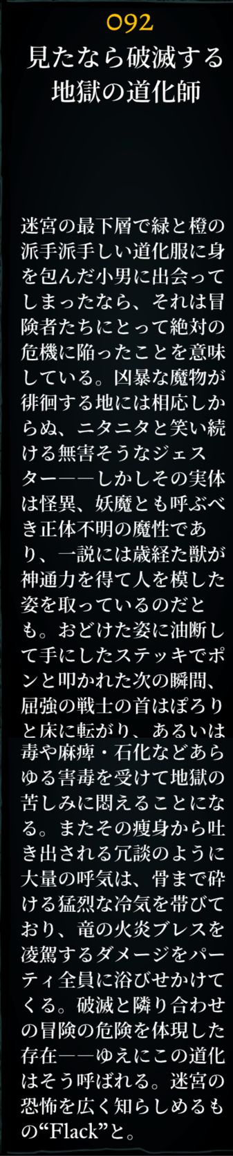 名称:ザ ハイ マスター グループサイズ :1 1匹あたりのXP(6人パーティ): 500 クラス:近接 Ac: -2 HP: 15-60 レジスト:炎/冷/睡眠 エクストラアクション:なし 特殊技:即死 -特性- 攻撃回数3回 10階に出現。最高位忍者。 No.85ハタモト+No.76レベル10メイジ1-6匹を引き連れ出現する。 HPは低めなので、全体範囲攻撃魔法を使うと護衛共に簡単に倒せるが、 使えない場合、+2系武器であっても近接3人が集中攻撃すれば倒せるだろう。 MABADIを使用して殲滅人数削減しても良い。余った人員はハタモト殲滅に充て、アーケイン魔法は一緒に出てくるレベル10メイジの殲滅に充てよう。 |