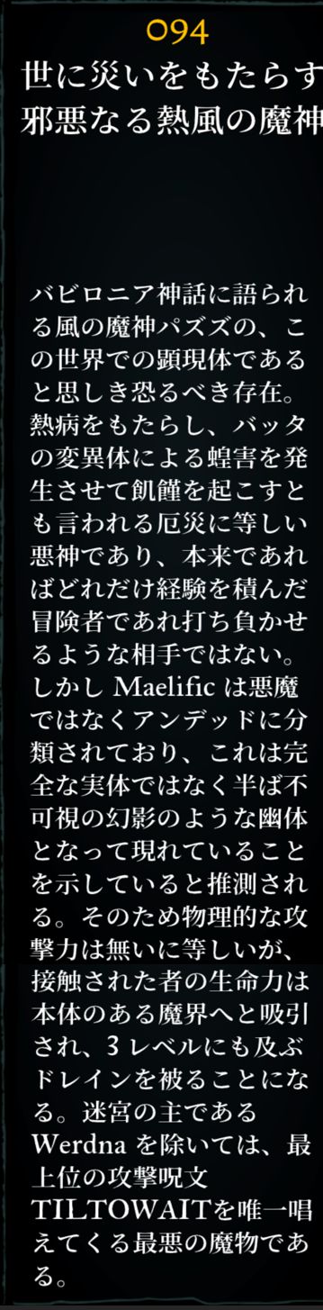 名称:メイルフィック グループサイズ :1 1匹あたりのXP(6人パーティ): 1243 クラス:アンデッド Ac: -5 HP: 25-100 レジスト:睡眠/魔法完全耐性50% エクストラアクション: ティア7アーケインスペル 特殊技:+3リジェネ、毒、麻痺、3レベルドレイン -特性- 攻撃回数2回 10階に出現。最強魔法TILTOWAITを使用。 No.88ポイズンジャイアント1-4匹を引き連れて出現。スペック的に敵が攻撃してくる前に撃破を求められる。 アンデッドなのでZILWANが効くこともあるが、確率は5割。DigitalEclipse版ではMABADIが効くようなので使用を推奨。近接3人の物理攻撃と組み合わせれば装備が貧弱でも勝てる可能性がある。ポイズンジャイアントもいる関係でMAKANITO詠唱も必要。 この敵に勝てるようになったらワードナに挑むと良い。 |