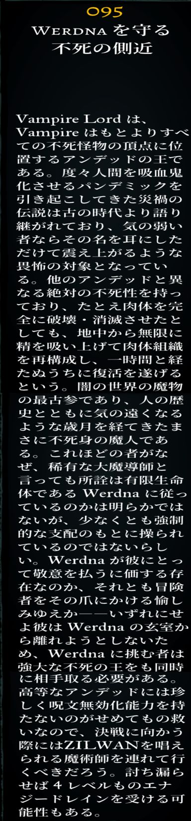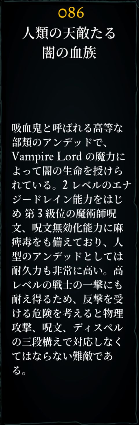 名称:ヴァンパイア グループサイズ :1-4 1匹あたりのXP(6人パーティ): 555 クラス:アンデッド Ac: -1 HP: 11-88 レジスト:睡眠/魔法完全耐性20% エクストラアクション: ティア3アーケインスペル 特殊技:麻痺、2レベルドレイン、+1リジェネ -特性- 攻撃回数3回 ワードナ事務所にも固定出現。数が1-4匹で2パーティで出現する場合があり。 2レベルドレインが脅威。 |