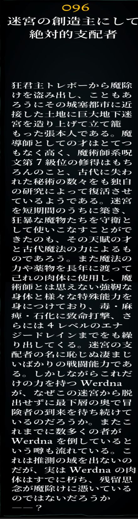 名称:ワードナ グループサイズ :1 1匹あたりのXP(6人パーティ): 2646 クラス:アーケイン Ac: -7 HP: 30-120 レジスト:炎/冷/睡眠/ 魔法完全耐性70% エクストラアクション: ティア7アーケインスペル ティア7ディヴァインスペル 特殊技:毒、麻痺、石化、即死、 4レベルドレイン、+5リジェネ -特性- 攻撃回数2回 ワードナ事務所に出現。最終討伐目的に見合った強さ。 MAELIFICよりすべてのステータスが20%ほど強力。 近接攻撃で削り切るにはVORPALBLADE以上の武器が2つはほしい所。 魔法完全耐性が70%なのでTILTOWAITが被弾してあっさり倒せたりするが、運ではなくじっくり育てたキャラクタの物理攻撃でねじ伏せたい。 |